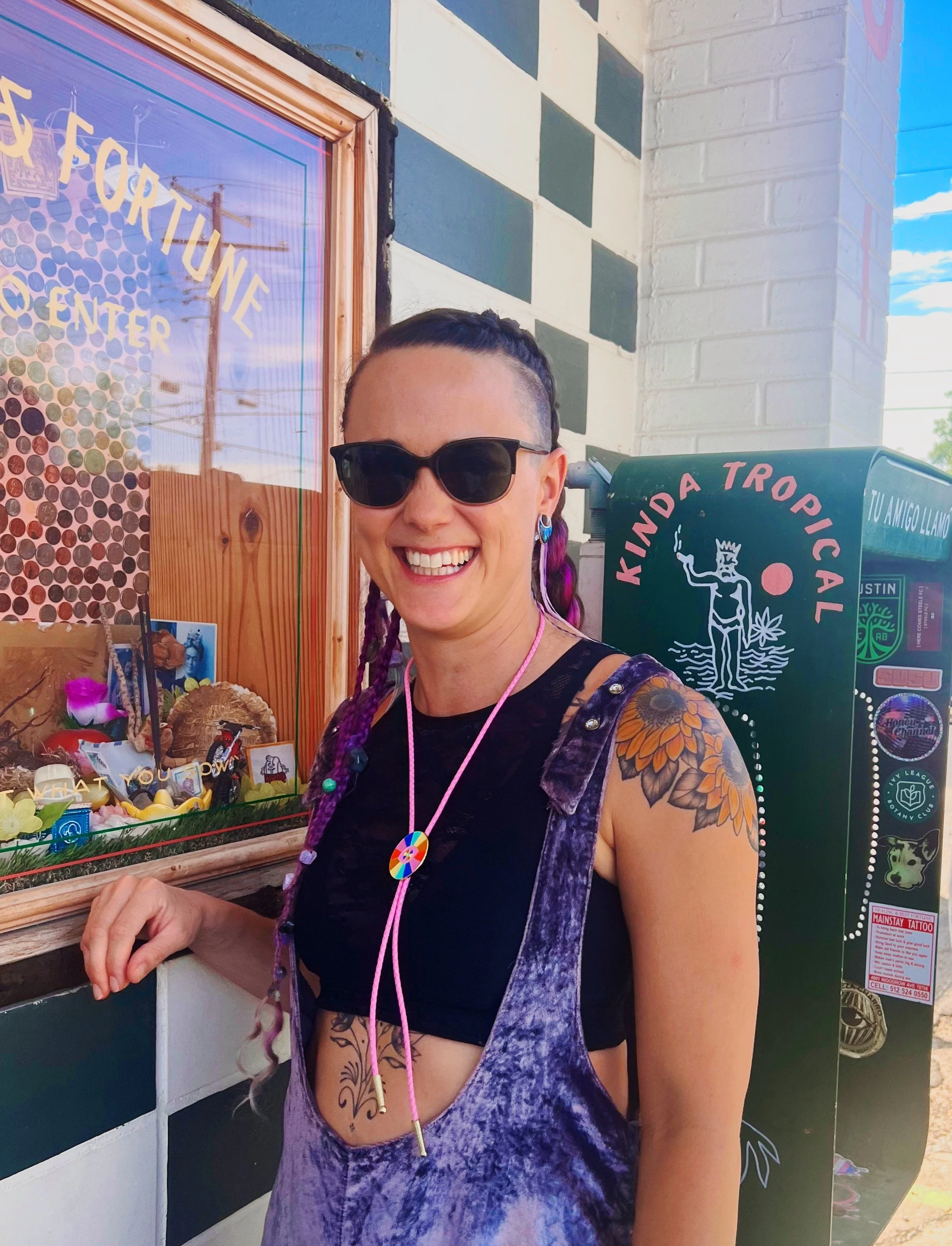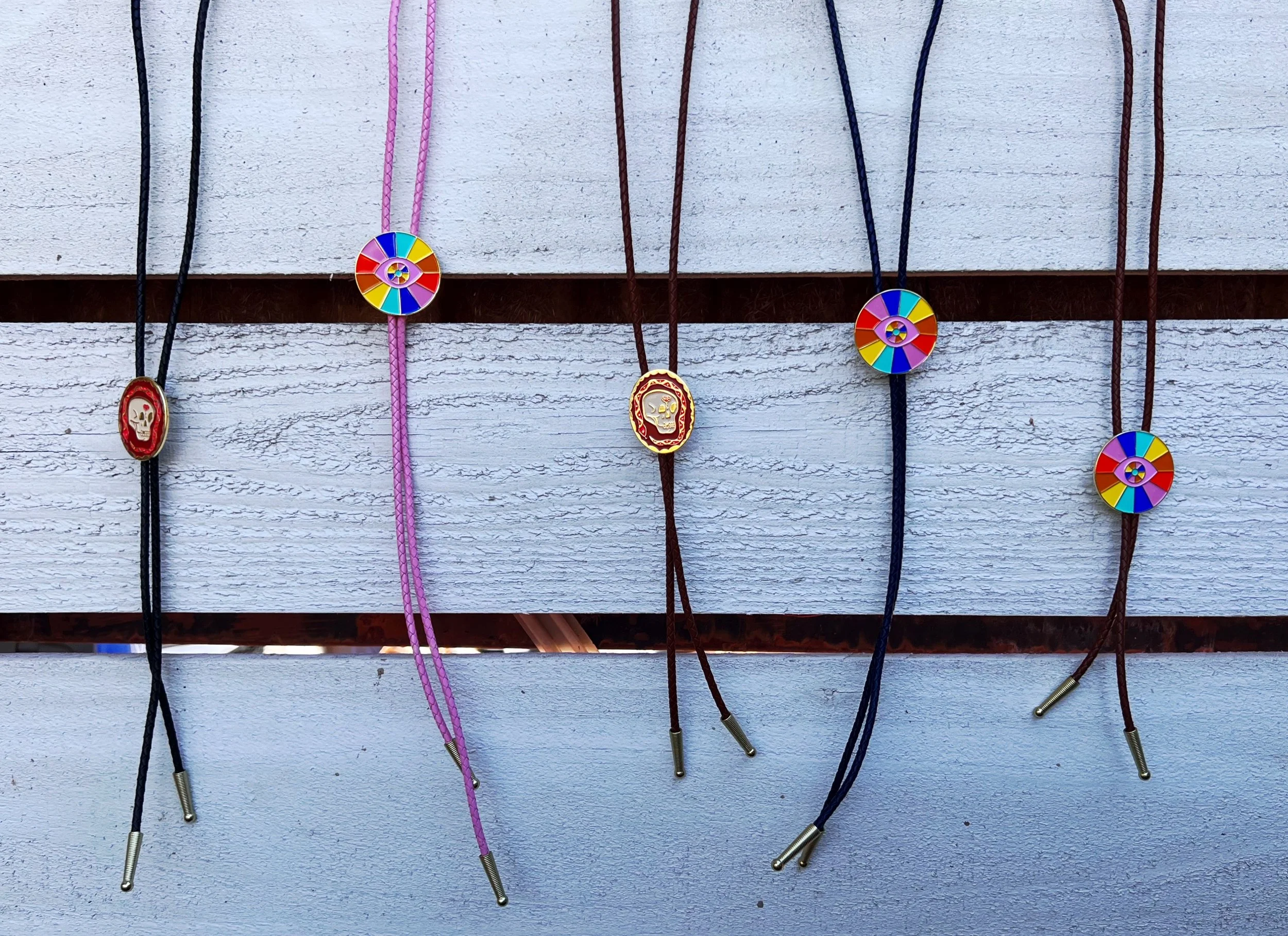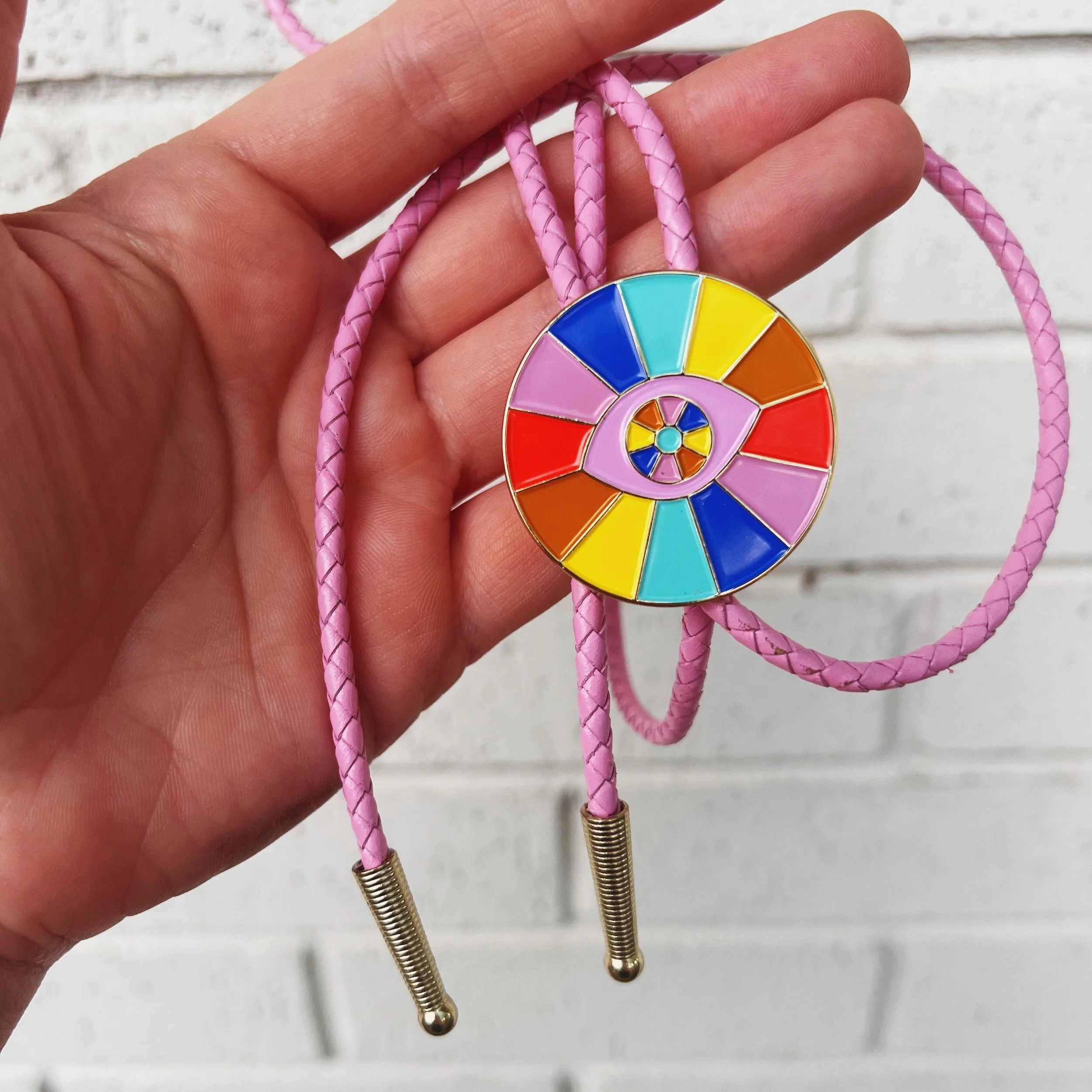 Soft enamel medallion with gold metal accents strung with braided leather bolo cord. Each Bolo tie is finished with gold metal tips. All bolo ties are handmade.